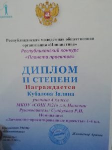 Учащиеся начальной школы приняли участие в Республиканском конкурсе «Планета проектов». КубаловаЗалина, ученица 4 «А» класса, и КубаловРадмир, ученик 3 «А» класса, были награждены Дипломами II и III степени соответственно, в номинации «Личностно-ориентированные проекты». Поздравляем ребят и желаем дальнейших творческих успехов!